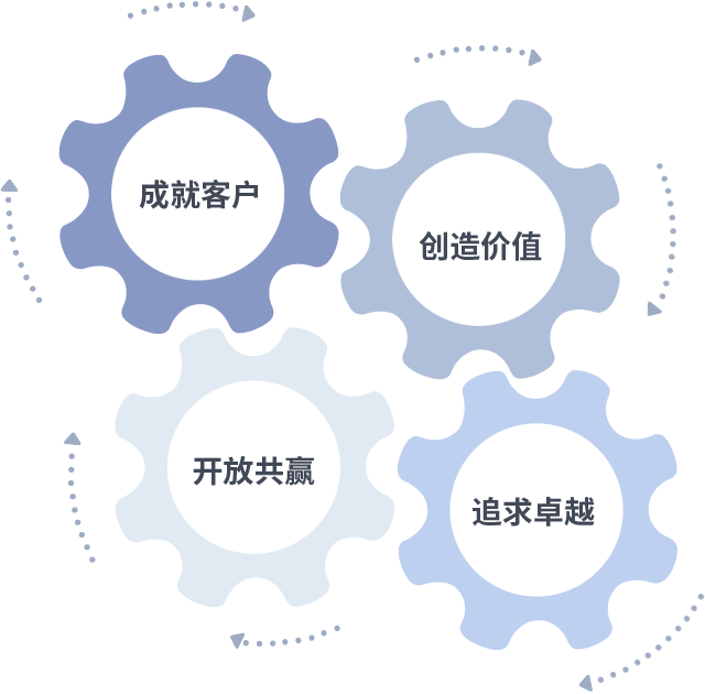 成就客户是一切决策的出发点,,创造价值是衡量所有工作的标准,,,追求卓越是我们做事做人的态度,,,开放共赢是我们的格局也是最终的结果。。。价值观的齿轮环环相扣,,,推动着组织里的每个人不断向前。。。